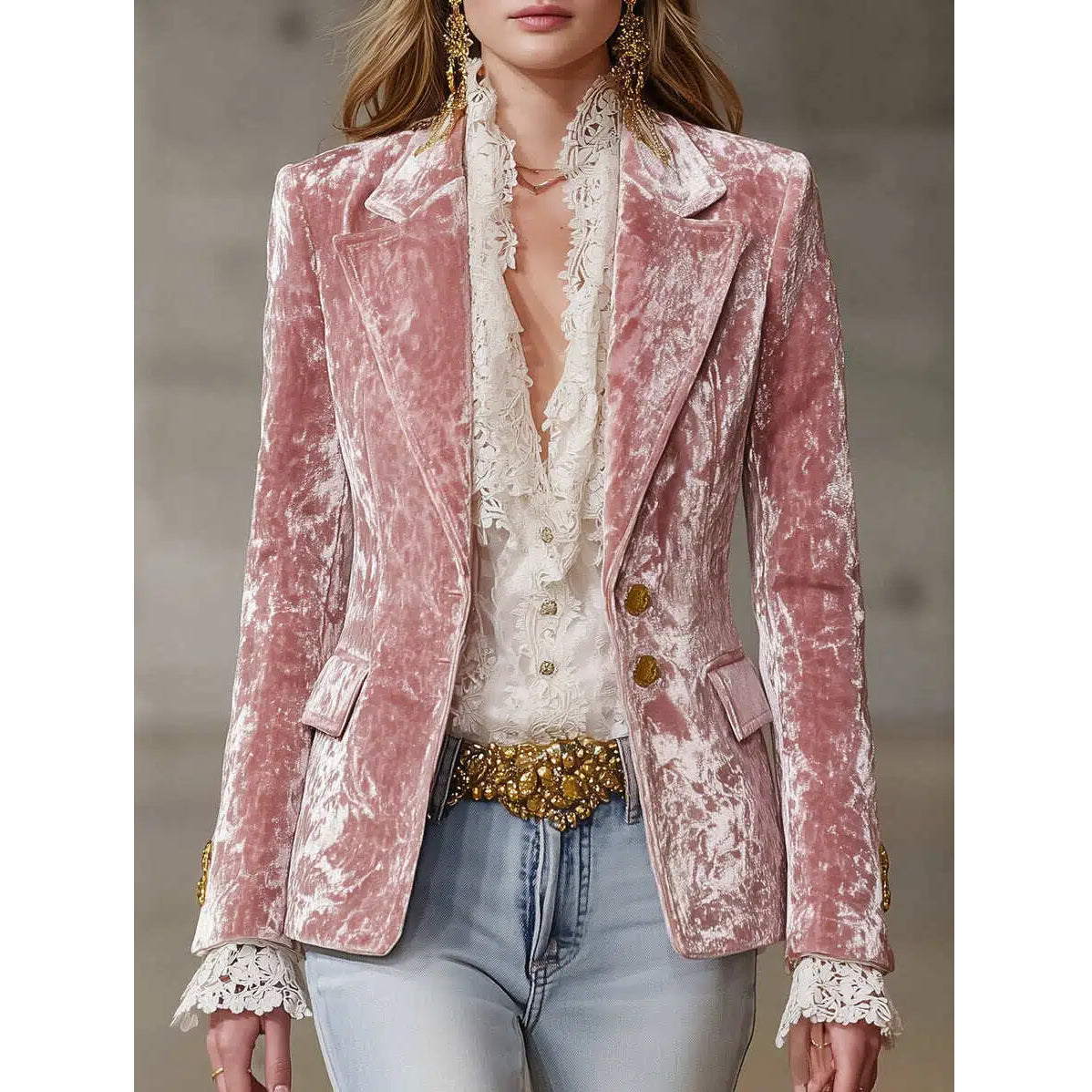 Fashion Retro Pink Velvet Gold Button Blazer