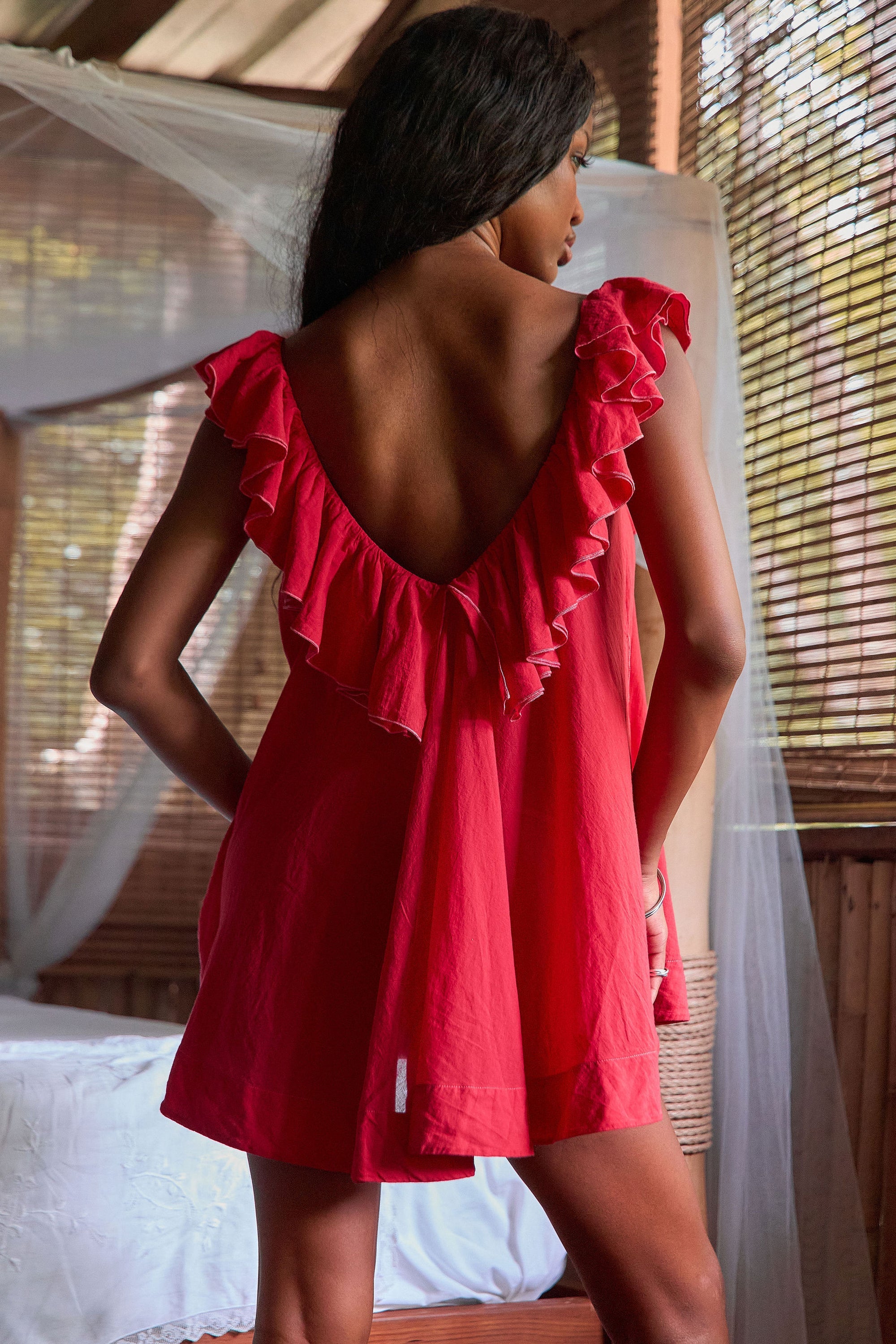 A cotton babydoll dress with delicate ruffle detailing along the neckline. Includes a matching lace trimmed slip dress with adjustable straps for full coverage and a matching sash that can be styled in multiple ways.