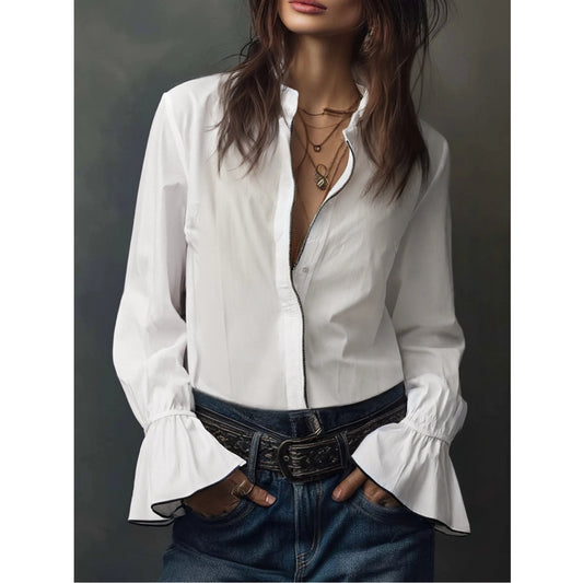 Vintage-Inspired White Zip-Front Blouse With Flounce Cuffs