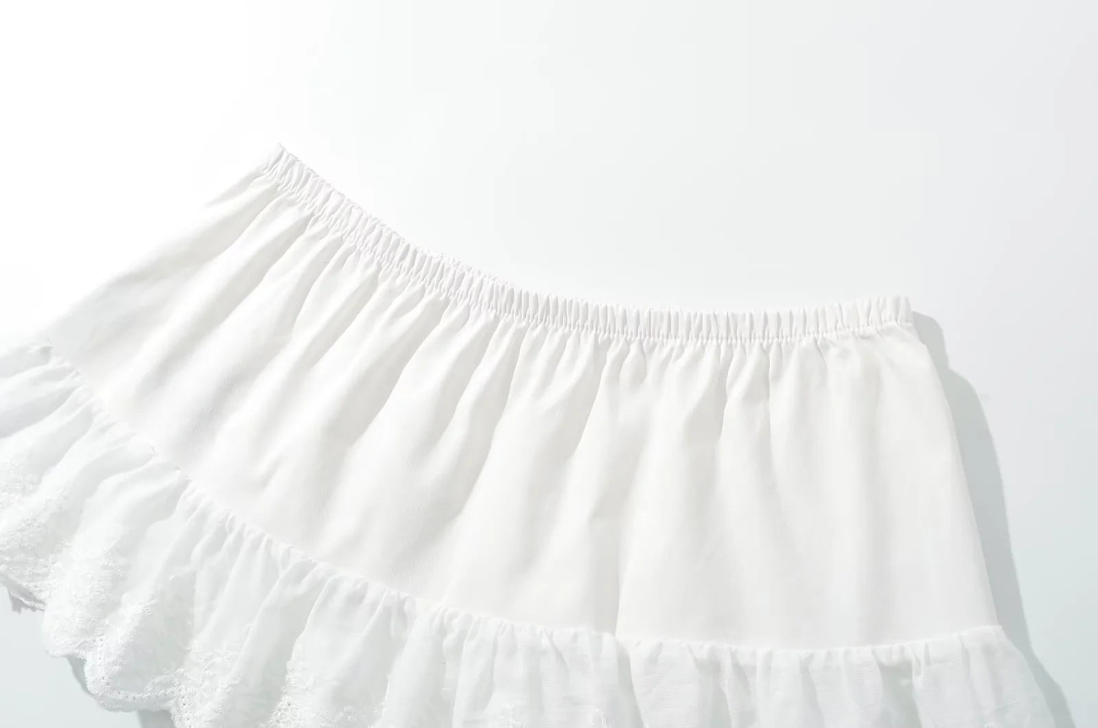 Organic Cotton Mini Skirt With Lace Trim And Tonal Satin Bow At Front.