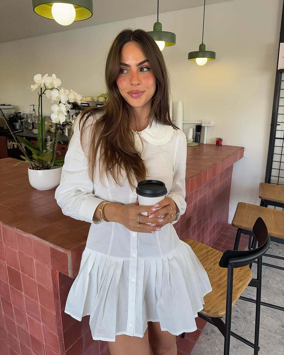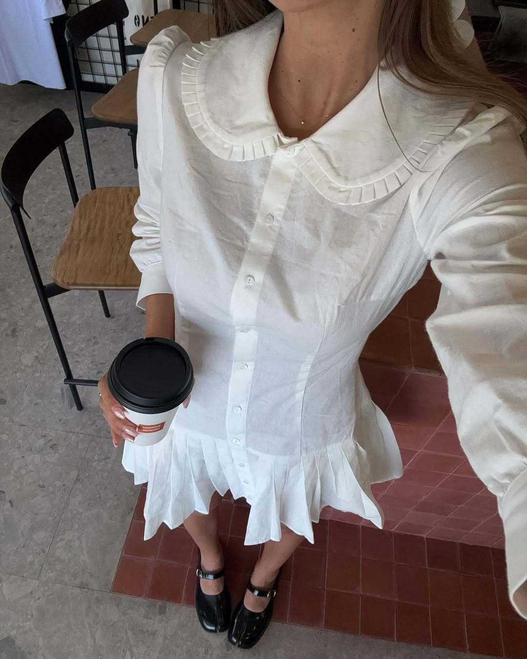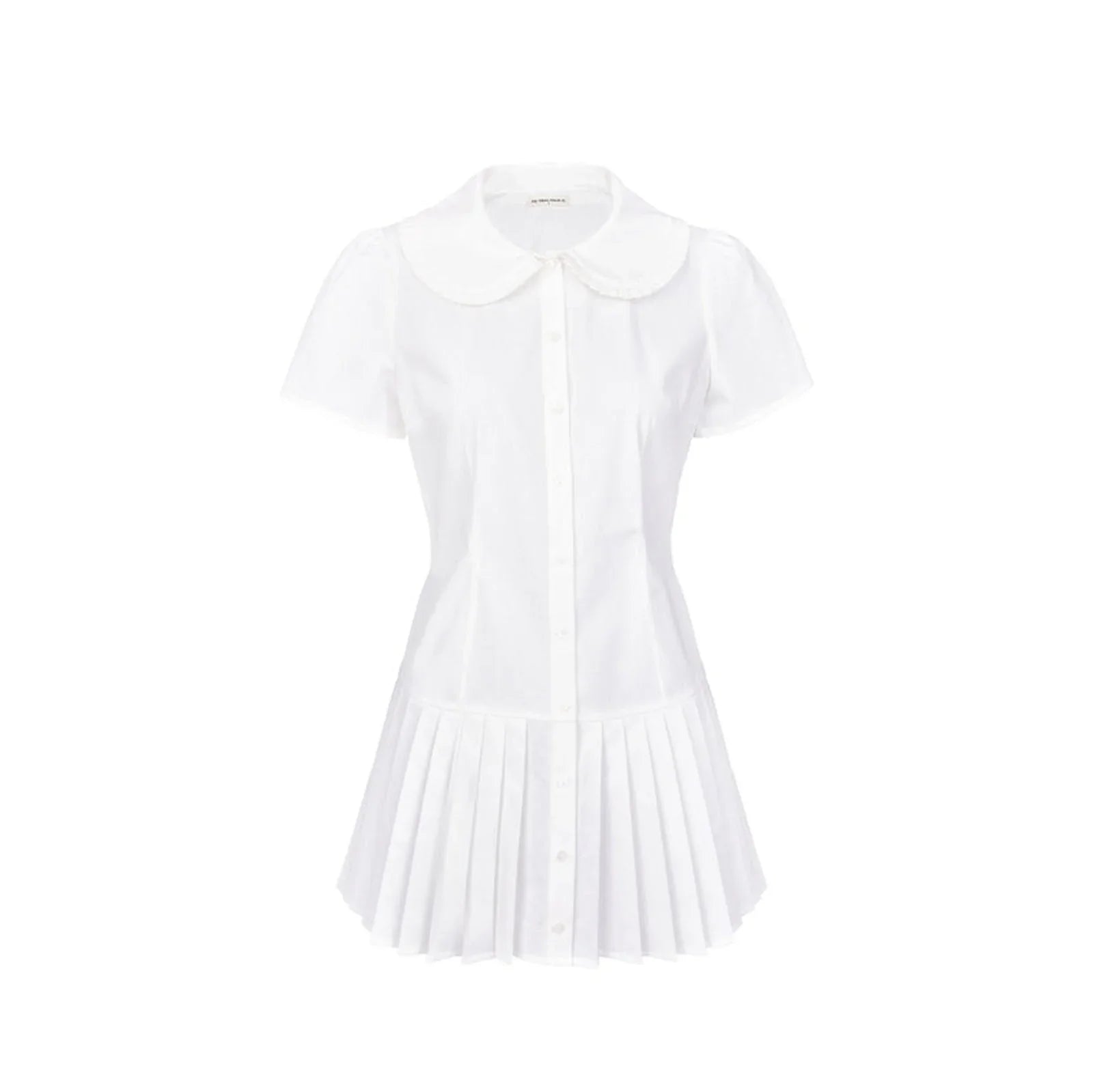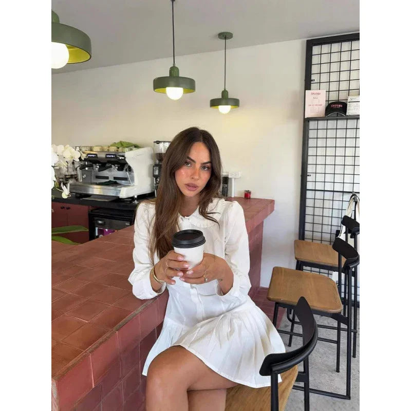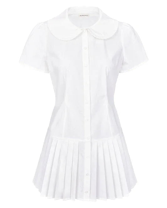 Long sleeve button-up shirt dress with turn down pleat collar. Pleated style skirt.Made from 100% Pima Cotton.