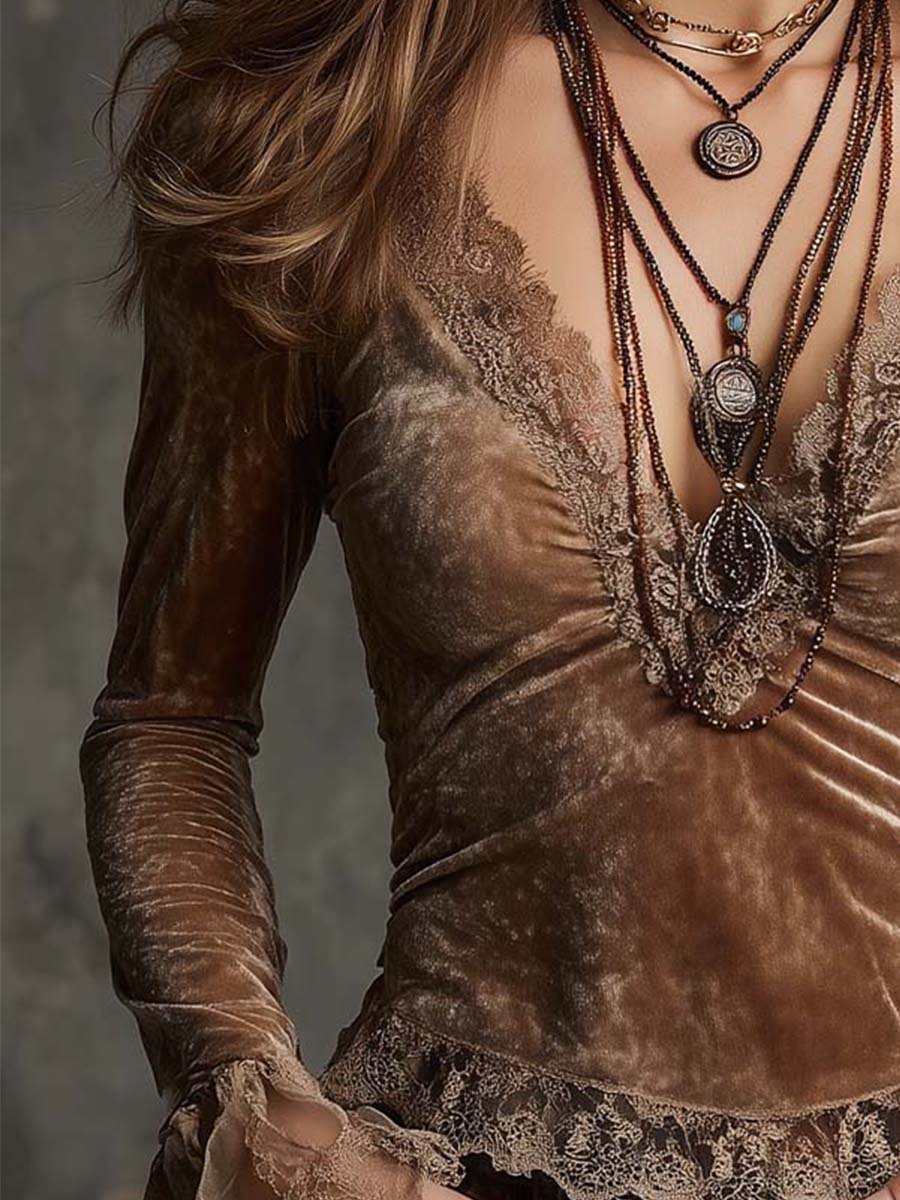 This exquisite vintage light brown top is crafted from luxurious velvet that exudes elegance and sophistication. The top is adorned with delicate lace trim along the edges, adding a touch of femininity to its long sleeves. The soft, muted brown shade makes it a versatile piece that can be worn for various occasions.