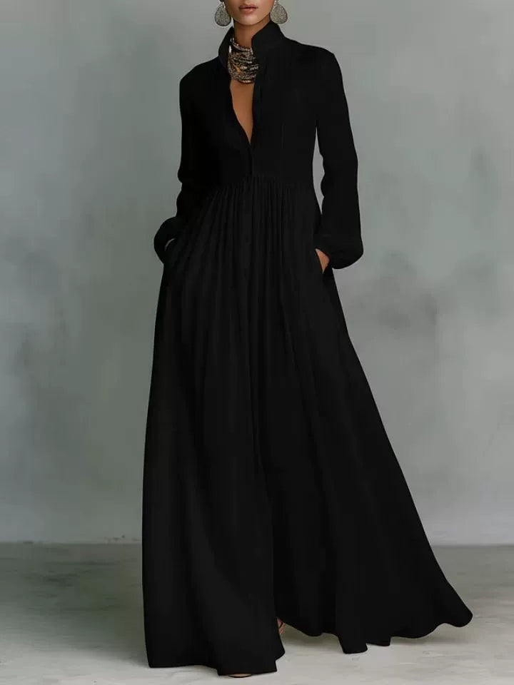 Women's Minimalist Cotton And Linen Patchwork Single-breasted Stand-up Collar Long-sleeved Maxi Dress